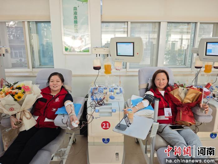 圖為鄭州志愿者蔡文慧(左)、余霞完成各自的第100次無償獻血。韓章云 攝