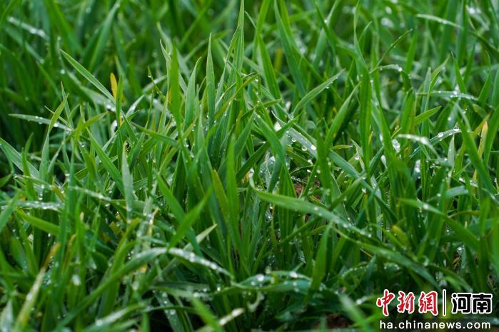 圖為掛著水珠的冬小麥麥苗。中新社記者 闞力 攝
