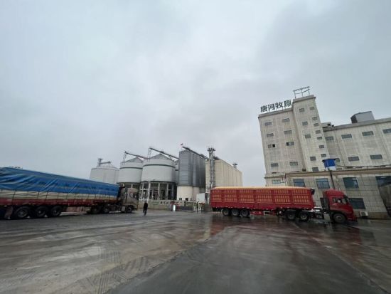 10月15日,雨歇云散,記者驅(qū)車趕往唐河牧原飼料廠。剛到廠區(qū)門口,就見十多輛拉糧半掛車在指定區(qū)域有序?浚{駛員師傅們有的在車?yán)锖藢?duì)預(yù)約信息,有的下車伸展身體,偶爾交流兩句:“牧原這預(yù)約機(jī)制真方便,按預(yù)約時(shí)間來,不用瞎等,入廠就能卸糧!”車身上“牧原助農(nóng),顆粒歸倉(cāng)”的字樣格外醒目。