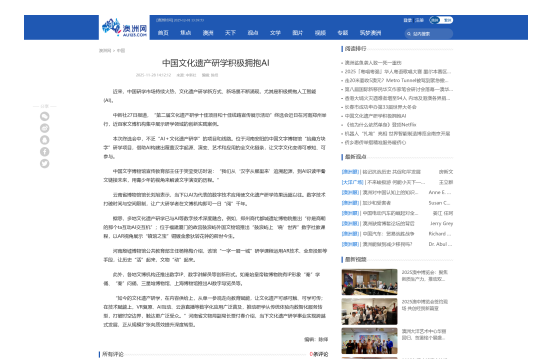 11月28日,《澳洲網(wǎng)》采用中新社河南分社稿件,題目:中國文化遺產(chǎn)研學(xué)積極擁抱AI