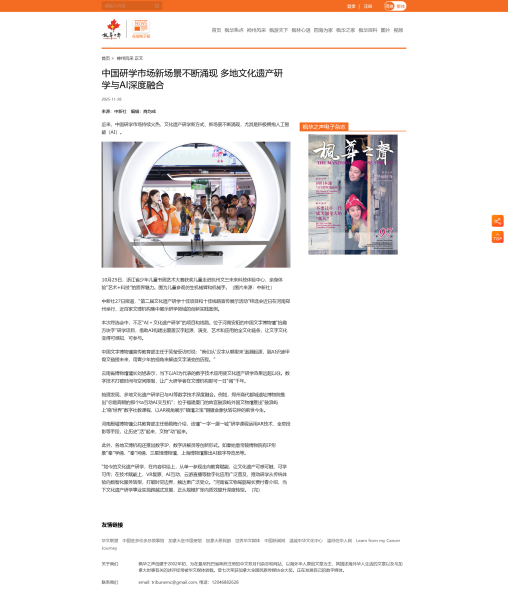 11月28日,加拿大《楓華之聲》采用中新社河南分社稿件,題目:中國研學(xué)市場新場景不斷涌現(xiàn) 多地文化遺產(chǎn)研學(xué)與AI深度融合